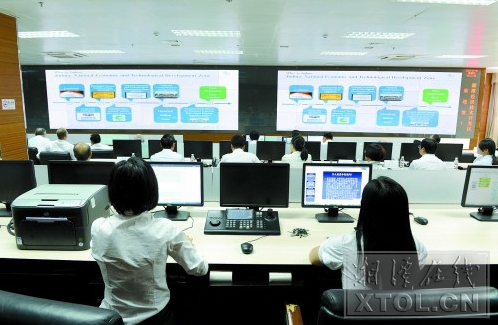 走進湘潭經開區綜合服務中心,首先映入眼簾的是一面墻大小的LED顯示屏。工作人員告訴我們,這塊大屏幕由多個城區電子監控視頻組成。透過它,轄區內每個角落的點點滴滴都能盡收眼底。