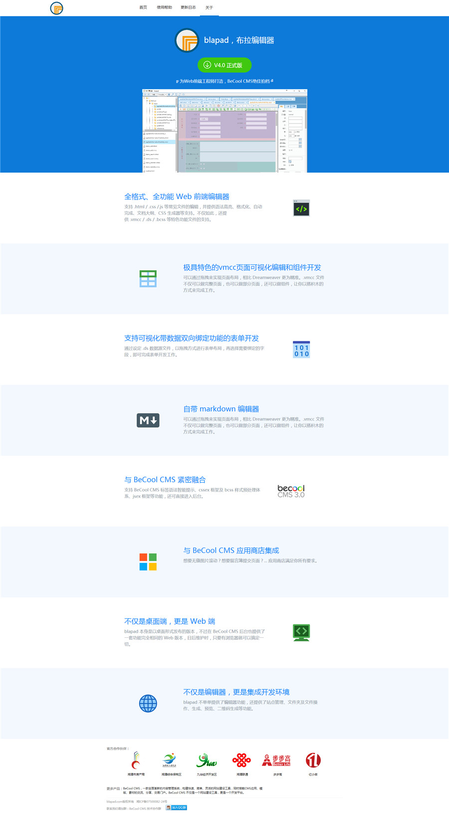布拉編輯器是 BeCool CMS 最佳開發伴侶,為其量身定做了很多功能,當然,在不采用 BeCool CMS 作為后臺的網站,也可以采用布拉編輯器,是前端開發的一枚利器。